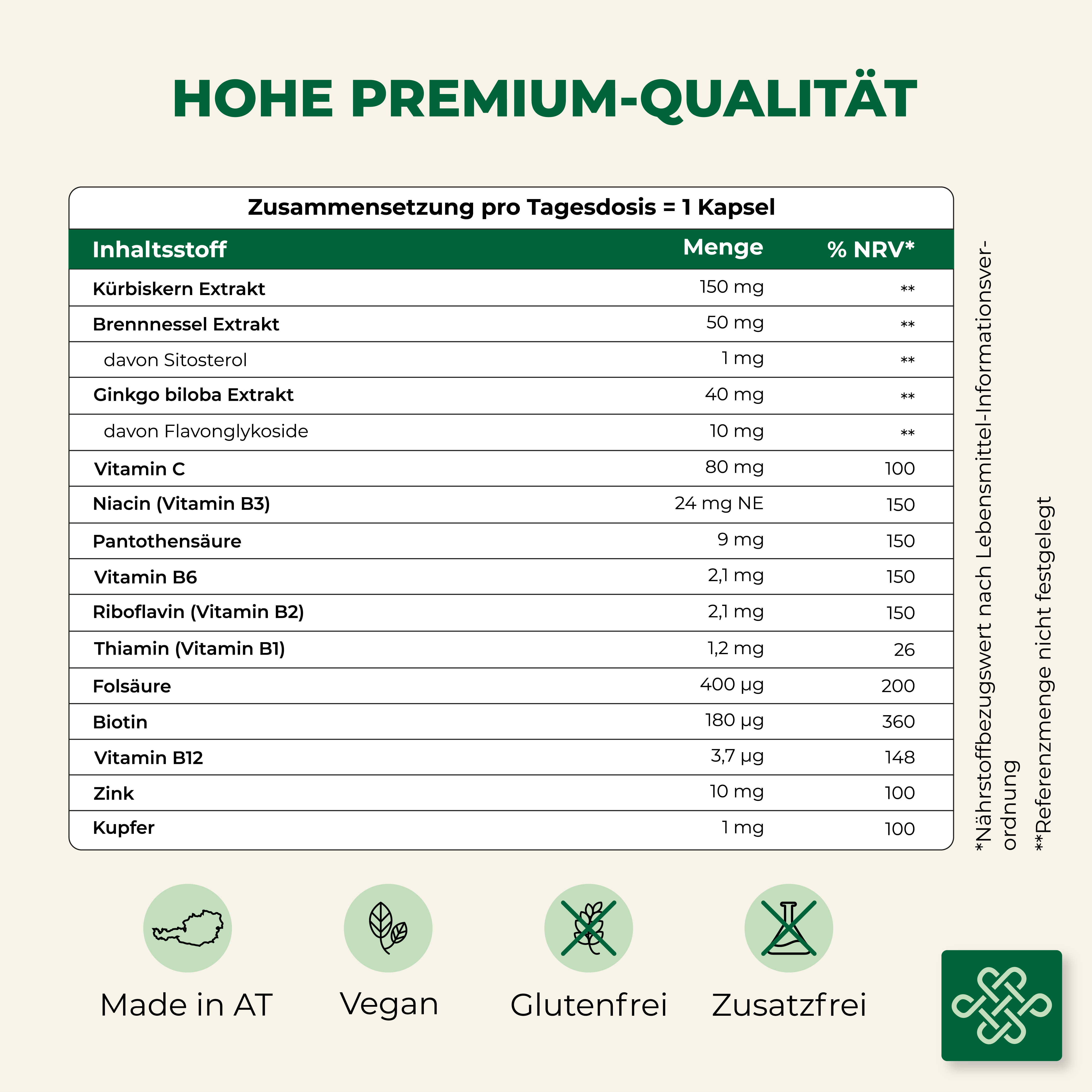 - Hochwertige Pflanzenextrakte: Kürbiskern-, Brennnessel- und Ginkgo Biloba Extrakte.
