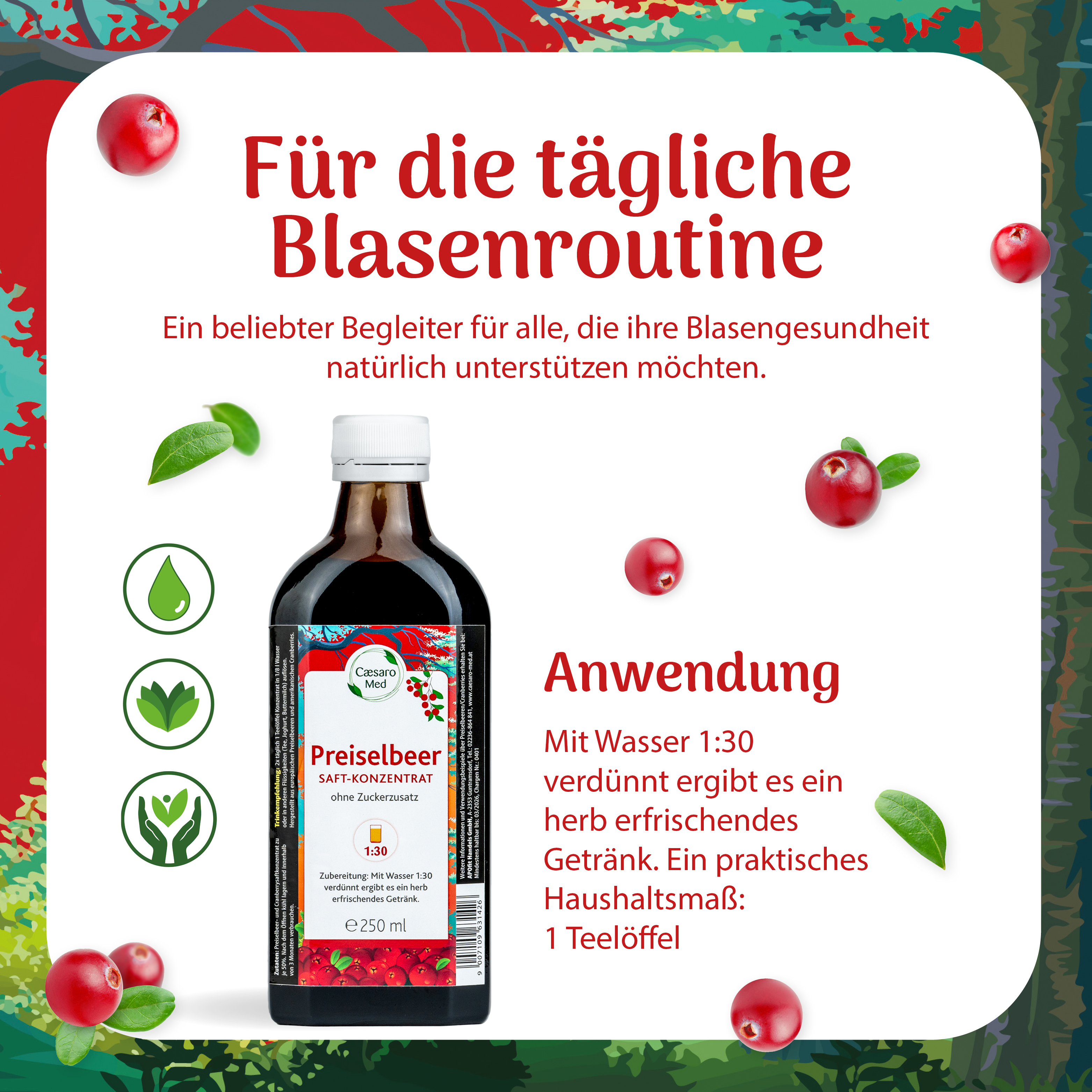 Preiselbeer Cranberry Saftkonzentrat zur funktionalen Unterstützung von Blase und Harnwegen.  Er enthält Proanthocyanidine (PAC), natürliche sekundäre Pflanzenstoffe aus der Cranberry, sowie Tannine aus der Preiselbeere. Diese Komponenten wirken gemiensam, um das Anhaften bestimmter Bakterien wie Escherichia coli an den Schleimhäuten der ableitenden Harnwege zu reduzieren. Dadurch wird die Wahrscheinlichkeit verringert, dass diese Bakterien an den Schleimhäuten der ableitenden Harnwege haften können und somit verringert in die Blase wandern können. Besoners wichtig ist es die Symptome einer Blasenentzündung frühzeitig zu erkennen und zu handeln.
