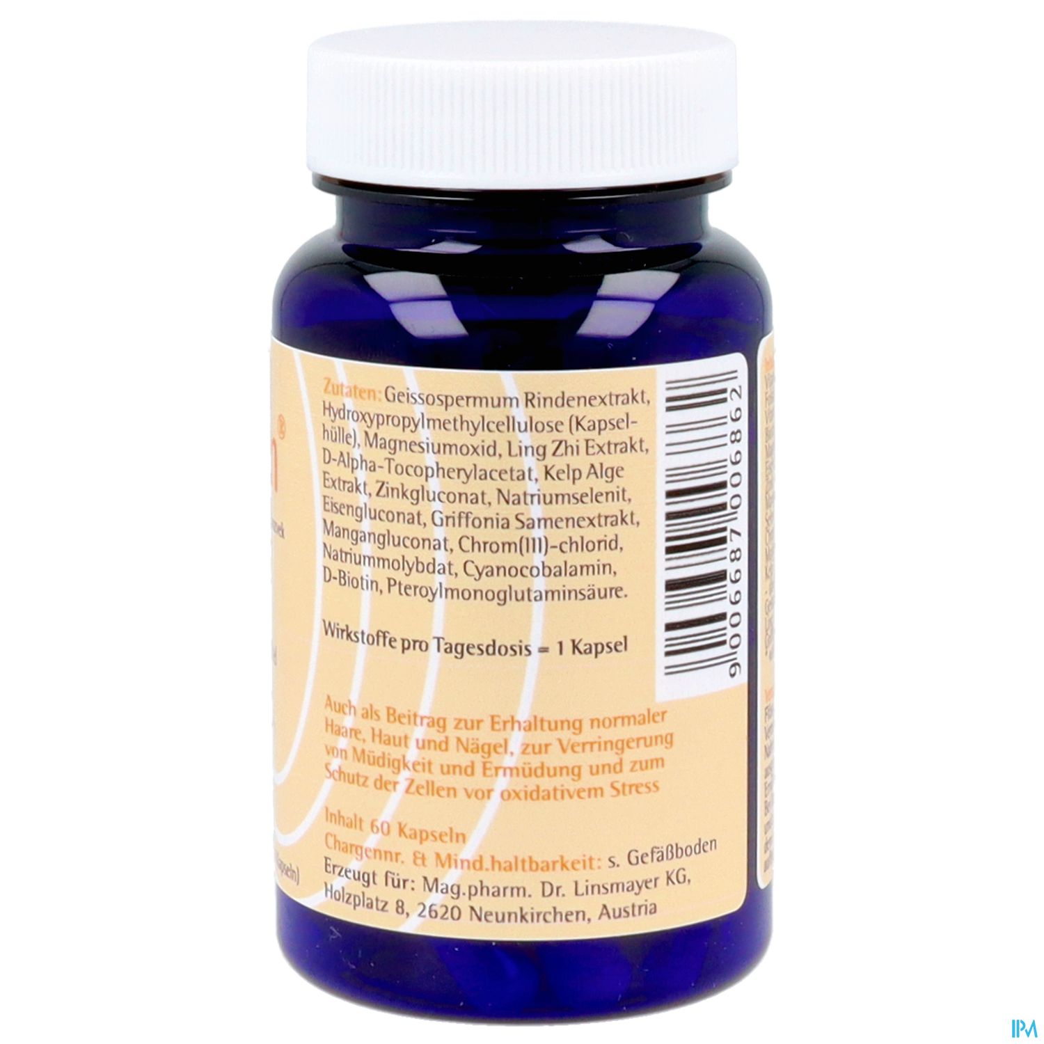 Pau pereira Rindenpulver, Ganoderma Lucidum Sporenpulver, Magnesiumoxid, Fucus vesiculosus Extrakt, Vitamin E, Zink-D-Gluconat-Hydrat, Natriumselenit, Eisen-II-Gluconat-2-Hydrat. Chrom-III-Chlorid, Natriummolybdat, Griffonia Extrakt, Vitamin B12, Folsäure, D-Biotin in Gelantinekapseln.
