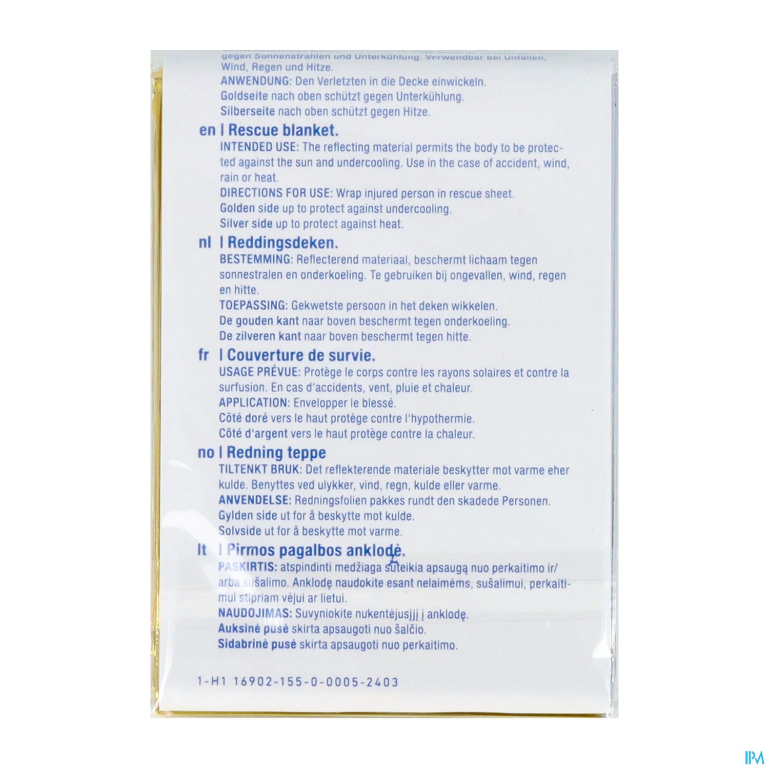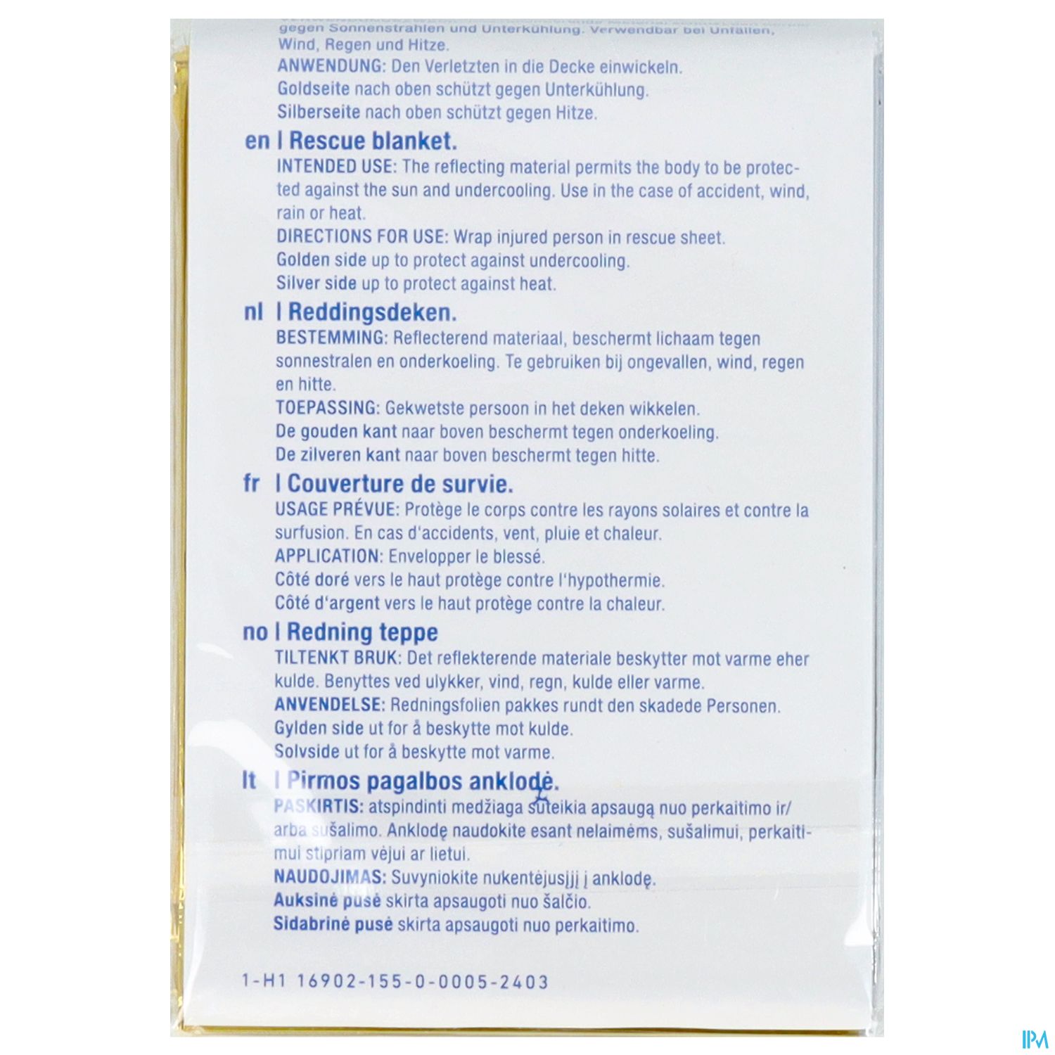- Als Kälteschutz: Gold/Grünseite nach außen, Silberseite nach innen: Körperwärme wird reflektiert.