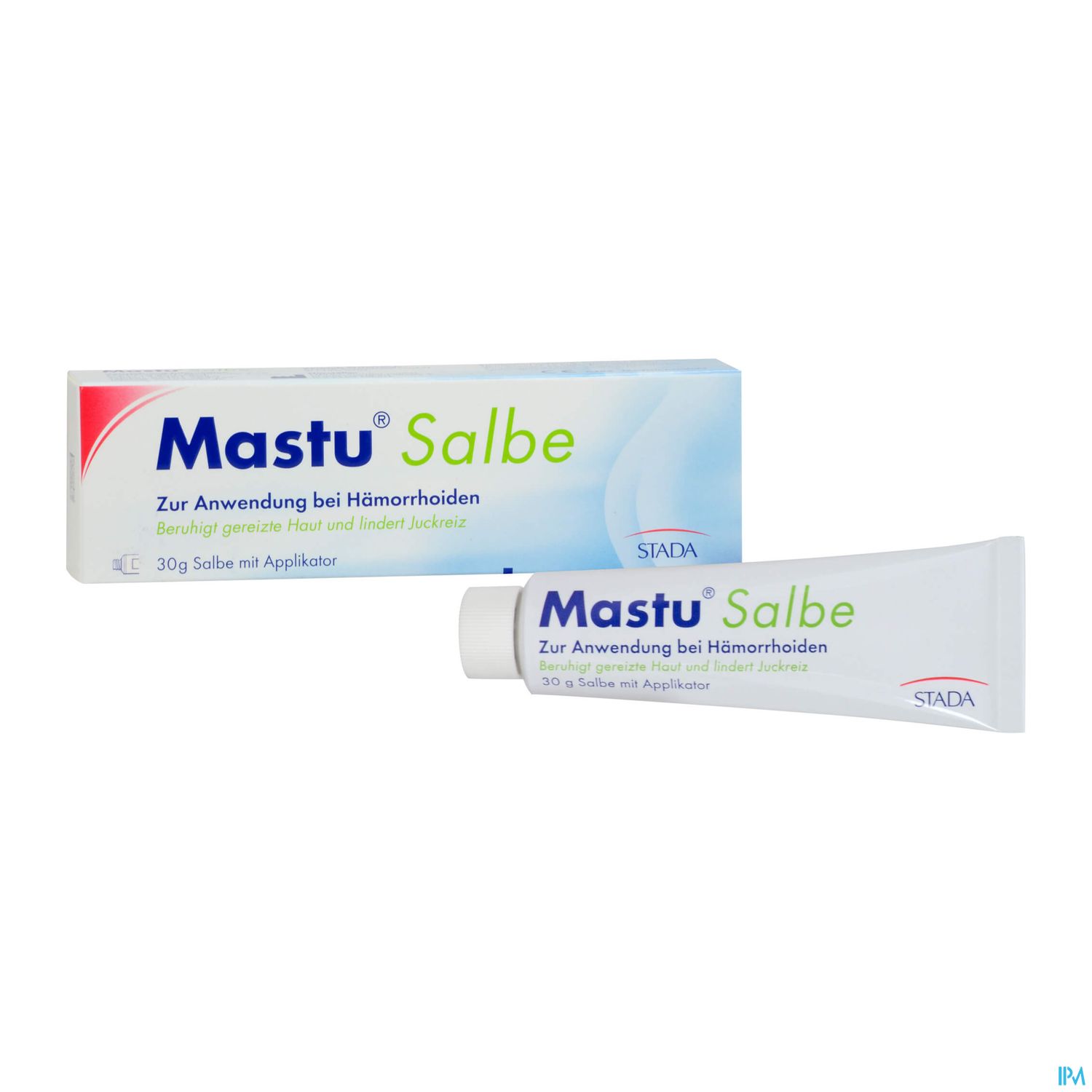 Mastu SalbeZur Anwendung bei HämorrhoidenWas enthält Mastu Salbe?Basisches Bismutgallat, Isopropylpalmitat, dünnflüssiges Paraffin, Polyethylenwachs, Sorbitansesquioleat, Sorbitol-Lösung 70%, Titandioxid (E171), Gereinigtes Wasser, Wollwachs.Wie sieht Mastu Salbe aus und wie viel Salbe ist in einer Tube enthalten?Mastu Salbe ist eine weiche, gelbe Salbe. In jeder Tube sind 30 g Salbe enthalten.Wofür wird Mastu Salbe eingesetzt?Mastu Salbe ist ein Medizinprodukt zur Anwendung bei Hämorrhoiden. Die Salbe lindert Beschwerden wie Reizungen, Juckreiz, Brennen und Nässen, die häufig im Zusammenhang mit Hämorrhoidalleiden auftreten und fördert die Wundheilung.Wann und wie sollten Sie Mastu Salbe einsetzen?Tragen Sie Mastu Salbe bei Bedarf 2-3 mal täglich in ausreichender Menge in und/oder um den After auf. Vor der Anwendung sollte die Haut mit warmem Wasser und einem weichen Lappen (ohne Seife) gereinigt werden. Sie können Mastu Salbe mit dem Finger oder mit dem beiliegenden Applikator auftragen. Drehen Sie dazu den Applikator auf die Tube und führen sie diesen in den After ein. Drücken Sie dann vorsichtig auf die Tube, bis die gewünschte Menge Salbe appliziert wurde. Reinigen Sie den Applikator anschließend, indem Sie ihn abschrauben und unter warmem Wasser ausspülen. Verschließen Sie die Tube mit der Verschlusskappe, um ein Austrocknen zu verhindern. Die Anwendungsdauer von Mastu Salbe sollte 30 Tage nicht überschreiten.Wann dürfen Sie Mastu Salbe nicht anwenden?Mastu Salbe darf nicht angewendet werden, wenn Sie überempfindlich (allergisch) gegen einen der Bestandteile des Präparates sind.Was müssen Sie vor oder während der Anwendung von Mastu Salbe beachten?Bei Blutabgang oder bei Verdacht auf Blut im Stuhl sowie bei gleichzeitigem Auftreten von Fieber und Schmerzen sollten Sie Mastu Salbe nicht anwenden und Ihren Arzt aufsuchen. Bitte sprechen Sie auch mit Ihrem Arzt, wenn Sie fortwährend Beschwerden mit Hämorrhoiden haben. Das Präparat ist ausschließlich zur Anwendung im Analbereich bestimmt und darf nicht eingenommen werden.Was müssen Sie bei der Anwendung von Mastu Salbe mit anderen Mitteln beachten?Wechselwirkungen mit anderen Mitteln sind bisher nicht bekannt geworden. Bitte informieren Sie dennoch Ihren Arzt oder Apotheker, wenn Sie andere Medizinprodukte oder Arzneimittel anwenden bzw. vor kurzem angewendet haben, auch wenn es sich um nicht verschreibungspflichtige Arzneimittel handelt. Sie sollten Mastu Salbe nicht zusammen mit anderen Cremes oder Salben zur Anwendung im Analbereich oder rektal einzuführenden Medikamenten (z.B. Zäpfchen) anwenden. Entfernen Sie eventuelle Rückstände anderer Salben oder Cremes im Analbereich vor dem Aufträgen von Mastu Salbe. Ebenso sollten Sie eventuelle Rückstände von Mastu Salbe vor der Anwendung anderer Cremes oder Salben im Analbereich beseitigen.Hinweis:Bei gleichzeitiger Anwendung von Mastu Salbe und Kondomen kann es zu einer Verminderung der Reißfestigkeit und damit zur Beeinträchtigung der Sicherheit der Kondome kommen.Was müssen Sie in der Schwangerschaft und Stillzeit beachten?Erfahrungen zur Anwendung von Mastu Salbe während der Schwangerschaft und Stillzeit liegen nicht vor. Bitte sprechen Sie daher vor einer Anwendung von Mastu Salbe mit Ihrem Arzt. Dieser wird den erwarteten Nutzen gegenüber den Risiken streng abwägen und über eine eventuelle Anwendung von Mastu Salbe entscheiden.Was ist bei Kindern und Jugendlichen zu beachten?Erfahrungen zur Anwendung von Mastu Salbe bei Kindern und Jugendlichen liegen nicht vor. Bitte sprechen Sie daher vor einer Anwendung von Mastu Salbe mit Ihrem Arzt.Welche Nebenwirkungen sind möglich?Es können Überempfindlichkeitsreaktionen auftreten. Mastu Salbe enthält Wollwachs, das örtlich begrenzte Hautreizungen (z.B. Kontaktdermatitis) auslösen kann. Informieren Sie bitte Ihren Arzt oder Apotheker, wenn eine der aufgeführten Nebenwirkungen Sie erheblich beeinträchtigt oder Sie Nebenwirkungen bemerken, die nicht in dieser Gebrauchsanweisung angegeben sind.Wie ist Mastu Salbe aufzubewahren?Für Kinder unzugänglich aufbewahren. Sie dürfen Mastu Salbe nach dem auf der Faltschachtel und der Tube angegebenen Verfallsdatum nicht mehr anwenden. Mastu Salbe darf nicht über +25°C gelagert werden.Vertrieb und Information:STADA GmbHStadastraße 2-18D-61118 Bad VilbelTelefon: 06101 603-0Telefax: 06101 603-259Internet: www.stada.de