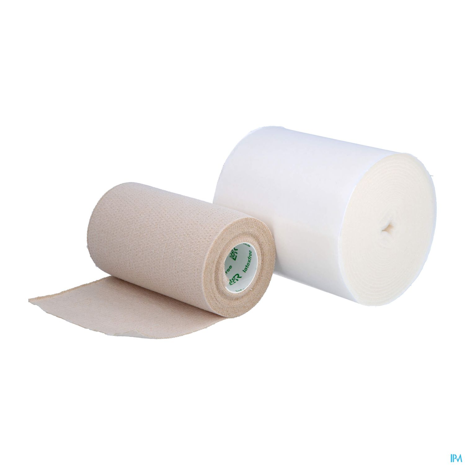 • kohäsive Kompressionsbinde -- haftet auf sich selbst und vermindert die Gefahr des Verrutschens bei hoher Stiffness.